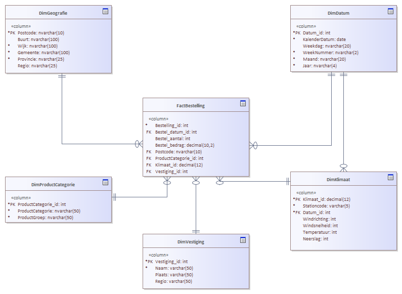 Fact voor de bestellingen gedaan. Gekoppeld aan de dimensie voor de datum en voor de geografische indeling