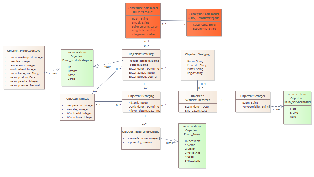 Dit is het logische datamodel van de bestellingen en bezorging van Alberto. Het is een vereenvoudigd model, de details van de klanten, producten etc zijn weggelaten