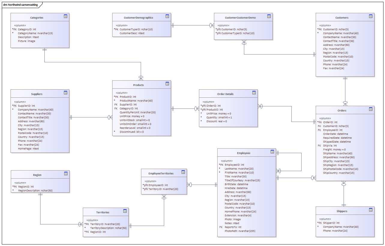 Datamodel voor Northwind met alleen de tabellen, kolommen en relaties.
