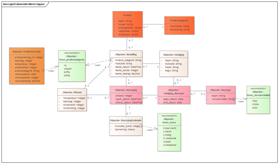 Dit is het logische datamodel van de bestellingen en bezorging van Alberto. Het is een vereenvoudigd model, de details van de klanten, producten etc zijn weggelaten