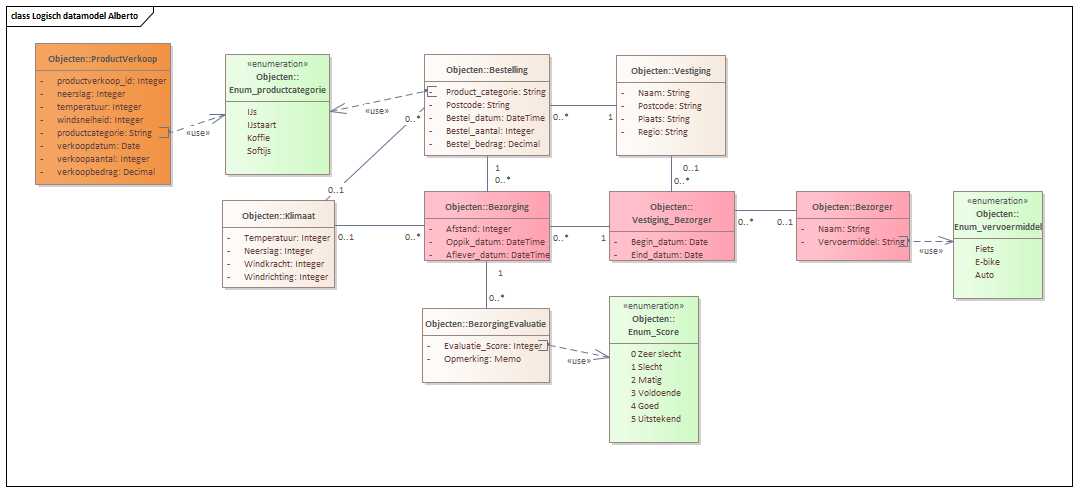 Dit is het logische datamodel van de bestellingen en bezorging van Alberto. Het is een vereenvoudigd model, de details van de klanten, producten etc zijn weggelaten