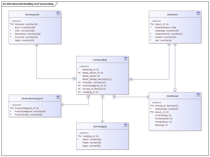 Fact voor de bestellingen gedaan. Gekoppeld aan de dimensie voor de datum en voor de geografische indeling